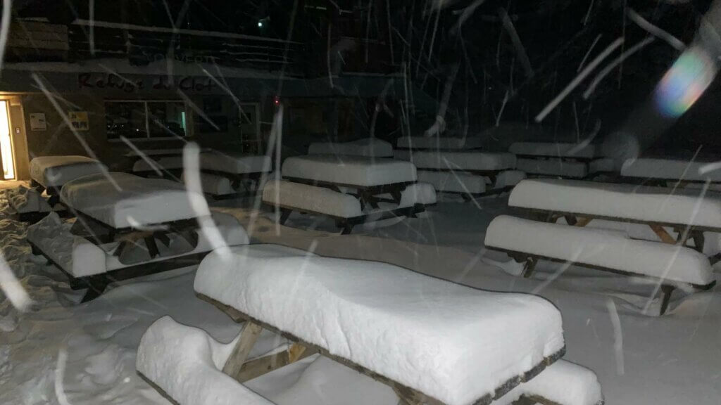 1h du matin, nous apercevons avec joie et soulagement les lumières du refuge (qui porte à ce moment là parfaitement son nom) à travers la neige épaisse qui tombe sans cesse, milliers de flocons scintillants dans les faisceaux lumineux de nos frontales.