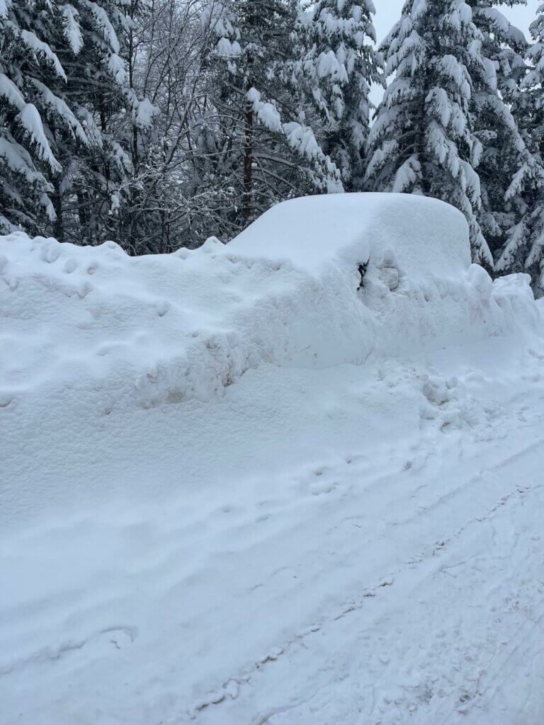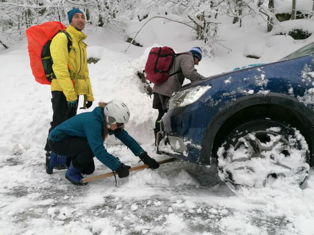 Après une douche rapide et un peu de ravitaillement au refuge, il faut trouver une pelle et le moyen de récupérer nos 4 véhicules éparpillés au bord de la route. Et la neige qui n'arrête pas de tomber!!!