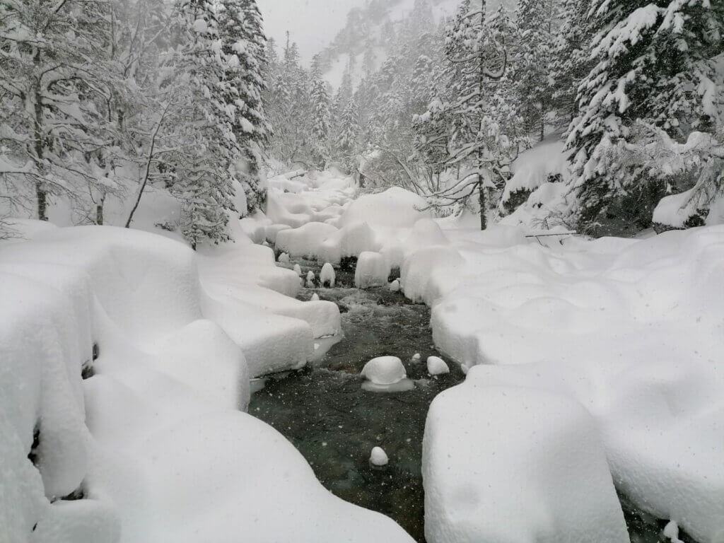 Vendredi fin d'après-midi, nous partons à 4 véhicules, en décalé en fonction de nos disponibilités, en direction de Cauterets puis du parking du Pont d'Espagne, où nous devons tous nous retrouver pour finir l'ascension avec les sacs et la joëlette, pour 15-20 minutes dans la neige à la frontale jusqu'au refuge. Facile.